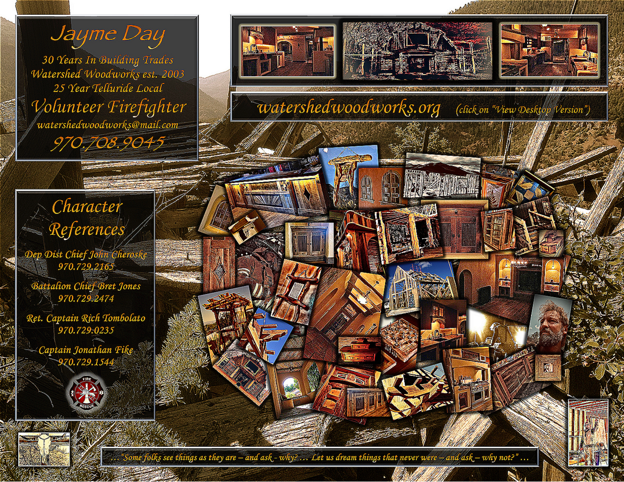 positions, including nearly 20 years in the supervisor roll in and around Philadelphia, Grand Junction, Albuquerque, Sayre Oklahoma, Gunnison and Telluride - all told constructing 20 or so residences from the concrete up to the final door knob, including several solar homes & straw
