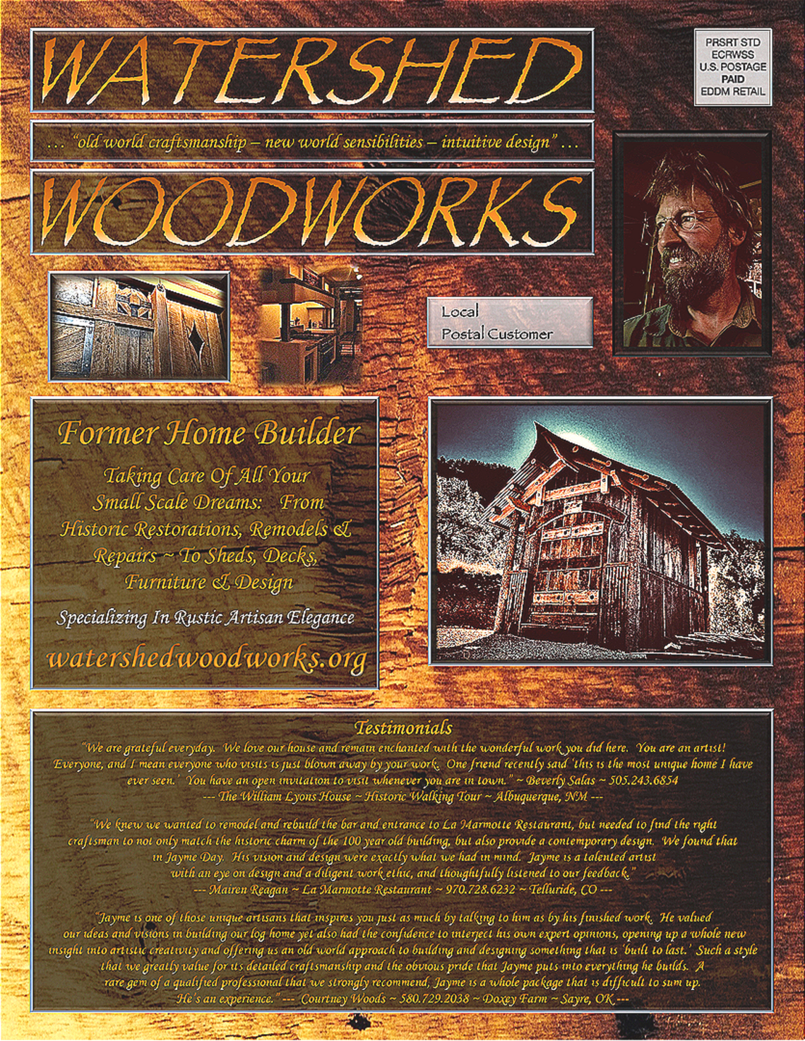 accord, and informed upon by creative life philosophies and rustic artisan elegance ..... In conjunction, I've additionally culled small teams together in order to work in tandem when necessary to expedite complexity - the 152 year old "William Lyons House" in Albuquerque, New Mexico as one fine example ..... Pictured in the 2nd gallery, and included on Albuquerque's prestigious "Historic Downtown Walking Tour," this once glorious hacienda and former schoolhouse had fallen into deep and dangerous disrepair over decades of neglect and disquiet ..... Replete with frayed knob & tube wiring dangling out of every conceivable orifice - compromised structural solidity, foundational detritus & crumbling adobe - and the artistic integrity of a paintbrush unburdened by paint, the building had become an apocryphal nightmare, a blight on the cityscape and an embarrassment to the community ..... Purchased by Watershed Woodworks in 2008 through thoughtful investment planning, the property was gutted & landscaped - repurposed, reimagined, rebuilt and restored to appropriate prominence by myself and my team over the course of three exceptionally rewarding years, and stands unique as the "piece de resistance" of a career now spanning three decades